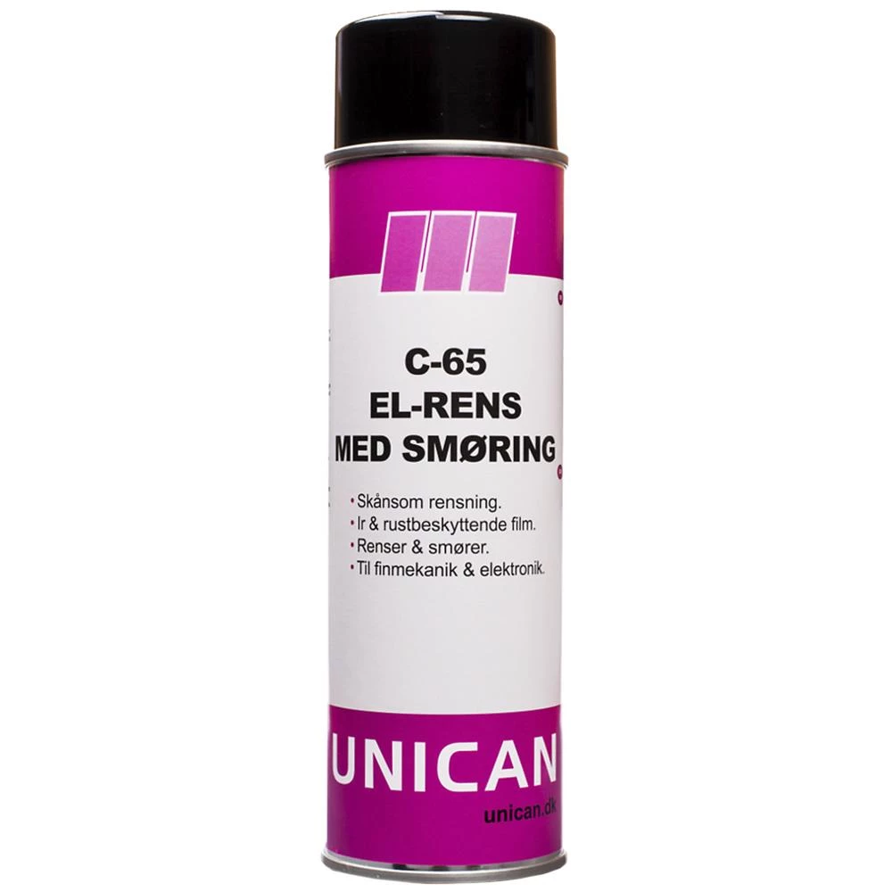Unican C-65 el-rens m/smøring 500ml. C-65 El-Rens med smøring anvendes indenfor finmekanik og elektronik-branchen til at løse en lang række opgaver, hvor en afrensning med en tynd smørende effekt ønskes. Produktet kan med fordel anvendes på kontakter, stik, relæer og andre mekaniske dele. Kan med succes anvendes på stort set alle materialer og angriber ikke plast, lakerede overflader m.m. C-65 El-Rens med smøring anvendes også indenfor kopi-branchen til at fjerne etiketrester fra skilte på kopi/fax-maskiner samt printere. Disse maskiner er ofte lavet af plasttyper, hvor andre afrensningsprodukter vil være uhensigtsmæssige. Strømtilslutning bør først ske når produktet er fuldstændig fordampet.