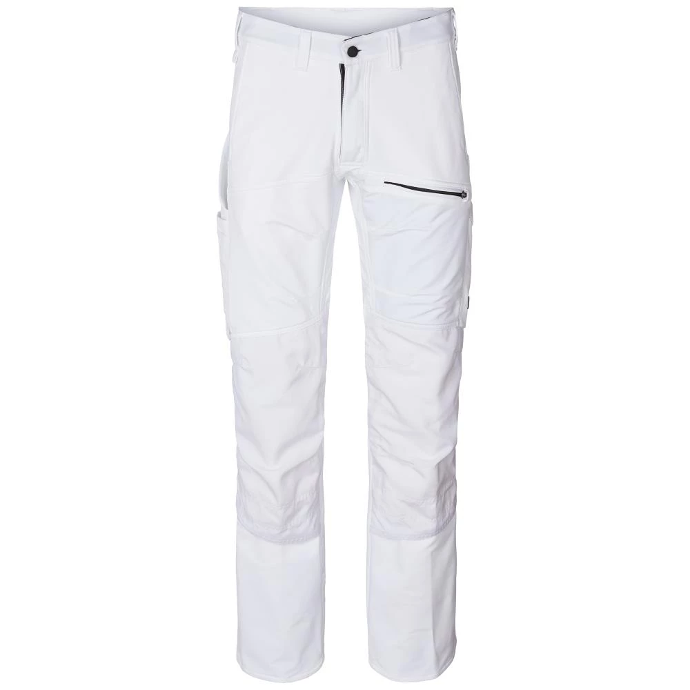 Evolve stretchbukser er smidige og komfortable arbejdsbukser med fuld stretch bagpå og ned langs benene, der giver 100% bevægelsesfrihed. Udviklet med adskillige ventilationsmuligheder bl.a. omkring knæ og lår for bedre komfort. Buksebenet er forlænget foran, så det lukker perfekt omkring skoen og sikrer, at du undgår grus og skidt. Cordura-forstærkede knælommer sikrer desuden en rigtig høj slidstyrke. Med lynlås i gylp, to sidelommer, strop til nøgler i linning i højre side, to baglommer – den ene med lynlås, dobbelt tommestoklomme forstærket med Cordura og blyantlomme. Multifunktionslomme på venstre lår med lynlås og indvendig ventilation, lomme på venstre side med trykknapslukning, formskårne knæ. Med Cordura-forstærkede knælommer med udvendig åbning forneden til højdejusterbare knæpuder og med lille lynlås til ventilation. Lynlåse i kontrastfarve og reflekterende detaljer på ben. Cordura-forstærket ved fod. Godkendt i henhold til EN 14404 sammen med knæpuder 127440 / OEKO-TEX certificeret. Produceret i 55% elastomultiester og 45% polyester. Vægt: 218 g/m².