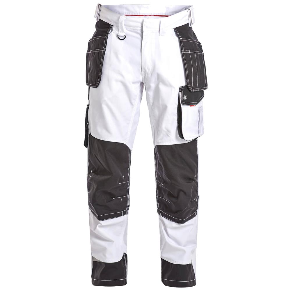 Funktionel arbejdsbuks med mange detaljer. Optimal pasform med bl.a. ergonomisk formet knæparti og panel i indersøm, der giver en behagelig skridtsøm. To rummelige skrålommer samt hængelommer foran. Strop med D-ring til fæstning af f.eks. Id-kort foran. To rummelige baglommer med klap og velcrolukning. Lårlomme med lynlåslomme til f.eks. mobiltelefon samt ekstra mindre lomme. Lårlommen har box-effekt, hvilket gør den meget rummelig og endvidere har den løsthængende bund for øget bevægelighed. Tommestoklomme med ekstra inddelinger og forstærket bund. Også tommestoklommen har frithængende bund for øget bevægelighed. Knæforstærkning/knælomme med velcrolukning forneden samt to indstillingsmuligheder til knæpude. Forstærkning i bunden af buksebenene både bagpå og foran for ekstra slidstyrke. Reflekser ved knæ og nederst på buksebenene for øget synlighed. Egnet til industrivask. Oeko Tex. Fås i flere farver og størrelser.