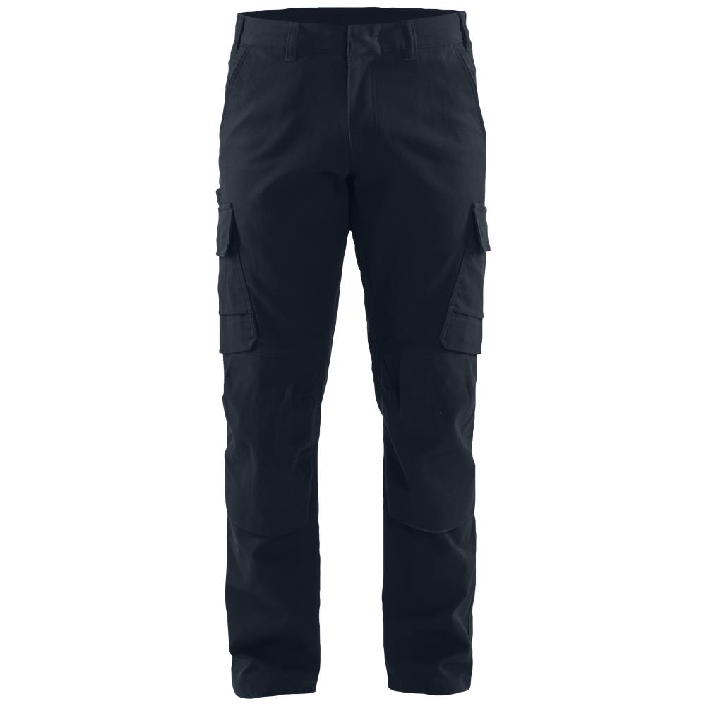 Industribuks med udvendig knælomme. Fleksibel bomuldscanvas med tovejs-stretch og elastisk talje for øget komfort. Ridsefrit design gør buksen ideel når der arbejdes i miljøer med følsomme overflader. Modellen har derudover metallynlås, trenålssømme på indvendige ben, D-ring og funktionelle lommer: baglommer (en med klap), lårlomme med læg og klap, indstikslomme med skjult lynlåslomme, indvendig telefonlomme og indvendig tommestoklomme. Industrivask EN ISO 15797. Fås i flere farver og størrelser.