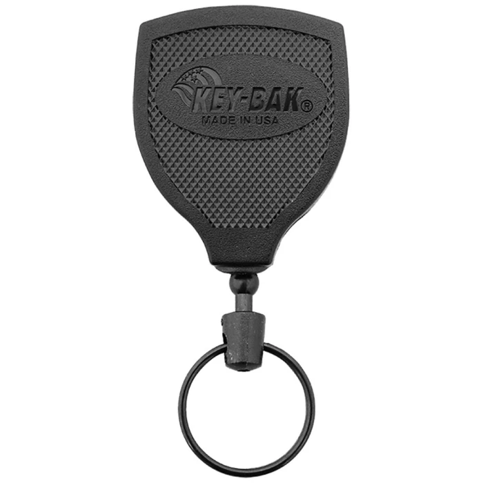 Key-Bak “Super 48 Plus” nøgleholder. Låsbar nøgle-“yoyo” med udtræk i begge sider, hvilket gør den nemmere at anvende uanset hvor og hvordan man står placeret. Modellen har en stor clips, så den passer i bælter op til 5,5 cm i bredden – og bælteclip-låsen sikrer at nøgleholderen forbliver i bæltet (kan ikke stjæles). Huset er udført i polycarbonat og nøglesnoren (120 cm) i Kevlar-materiale med plads til 15 nøgler.