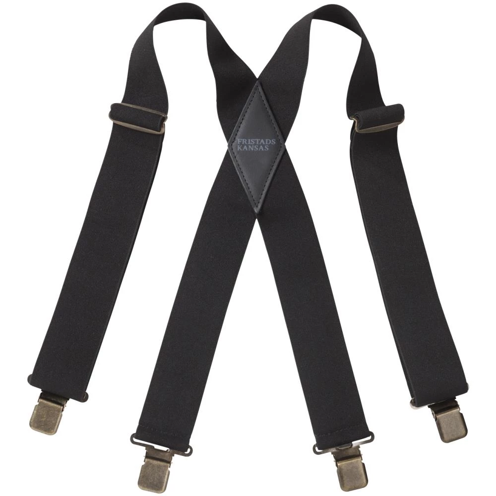 Elastiske stropper/clips og længderegulering med ekstra styrke i antikmessing/50 mm webbing. Polyester/polyamid.