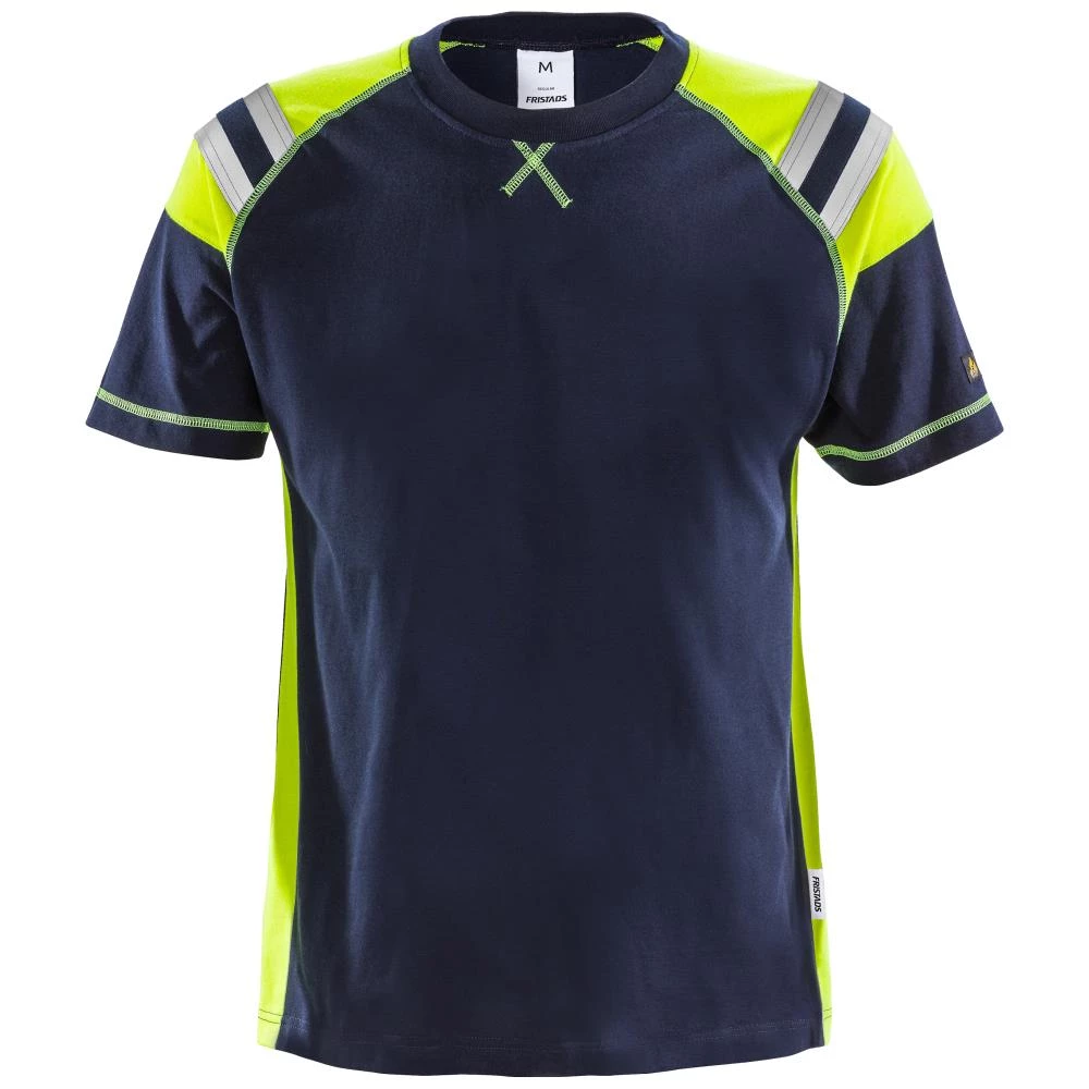 Flamestat T-shirt 7073. Blød og behagelig brandhæmmende T-shirt fremstillet i strikmateriale. Detaljer i stærk gul farve, der giver større synlighed. Design med ribkrave og refleksdetaljer på skuldrene. Godkendt til industrivask. Bruges sammen med tøj iht. EN ISO 11612. Godkendt iht. EN ISO 14116 Indeks 3 og EN 1149-5. Oeko Tex certificeret. Fås i flere størrelser.