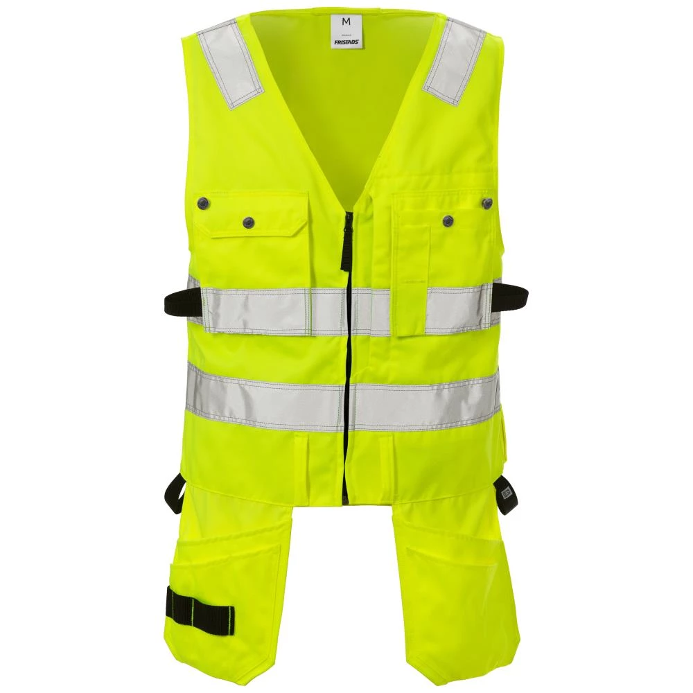 Hi-vis-certificeret vest med justerbar vidde, så den kan bæres uden på både sommer- og vinterjakker. Vesten har justerbar bredde ved lukningen foran. To løsthængende brystlommer med trykknapper til påsætning, en med klap og trykknap, en med trykknaplukning og blyantlomme. Knapper og stopper til knivhylster. D-ring under klap. To Cordura-forstærkede løsthængende lommer, en med tre ekstra lommer og værktøjsstrop, en med værktøjslomme. To Cordura-forstærkede løsthængende baglommer, en med ekstra værktøjslomme. To hammerstropper. Bæltestropper. Refleksbånd på skuldre. Godkendt iht. EN ISO 20471. Godkendt efter 50 vaske. Godkendt til industrivask iht. ISO 15797. Oeko-Tex certificeret. Fås i flere størrelser.