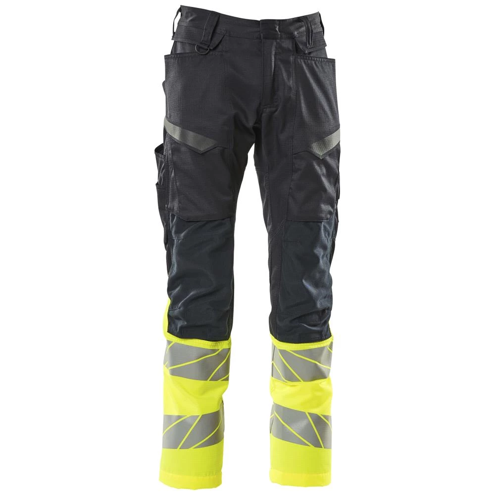 Accelerate Safe buks i let og stærk stofkvalitet med ripstop. Ripstop er en særdeles rivfast vævning, der sikrer, at stoffet holder i lang tid. Buksen er designet i kombination af fast stof og strækstof, og strækstoffet er placeret, hvor der er brug for ekstra bevægelsesfrihed. Derudover er buksen designet med ergonomisk formede bukseben konstrueret efter kroppens naturlige bevægelser. Der er forberedt til hængelommer 19450-126, som påsættes med knapper. Modellen har tonålssømme på ben og i skridt, skjult knaplukning, bæltestropper, D-ring, gylp med lynlås, forlommer, baglommer med forstærkninger, skjult hammerstrop i højre side, forstærket tommestoklomme, lommer med klap foran på lår, regulerbare knælommer i slidstærk Cordura (500 D) – med nem, individuel regulering af højden, samt lårlomme med telefonlomme og klap med skjulte trykknapper. Skridtlængden kan forøges med 3 cm ved at fjerne den indvendige, røde syning ved fod. Knæpuder 00418-100, 00718-100, 50451-916 og 20118-915 anbefales til denne model. Samcertificeret med knæpudetype Short eller Long iht. EN 14404. Oeko-Tex Standard 100. EN ISO 20471. Hi-Vis gruppe Z. Fås i flere farver og størrelser.