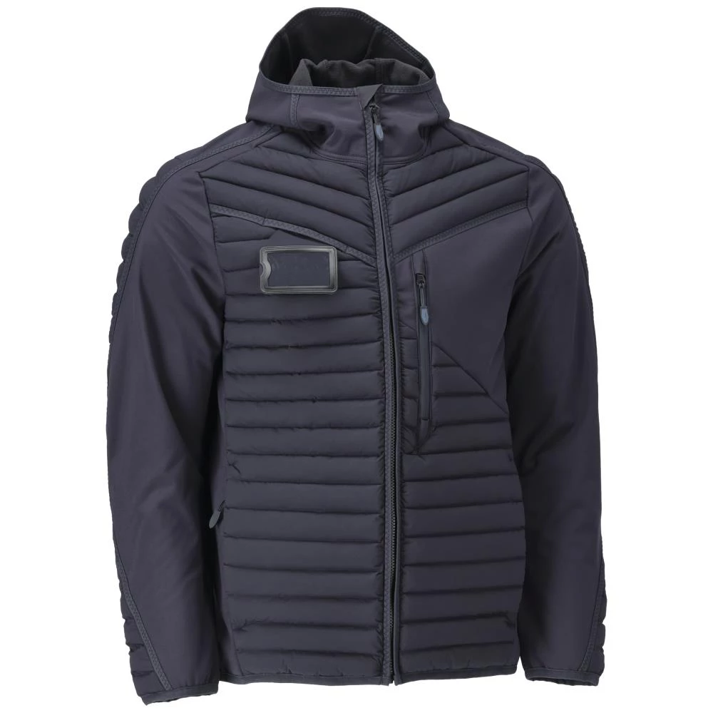 Customized jakke med hætte. Jakken er lavet af åndbar og vandafvisende quiltet metervare med stretch og har en moderne pasform. Luftig og let isolerende. Bolde til brug ved tumblertørring medfølger. Modellen har lukning med lynlås, brystlomme og forlommer med lynlås, inderlomme i netmateriale, aftagelig ID-kortholder, ergonomisk formede ærmer – som giver stor bevægelsesfrihed, samt elastikbånd ved håndled og i nedre kant. Høj andel af genanvendt polyamid i hovedmaterialet. Oeko-Tex Standard 100. Fås i flere farver og størrelser.