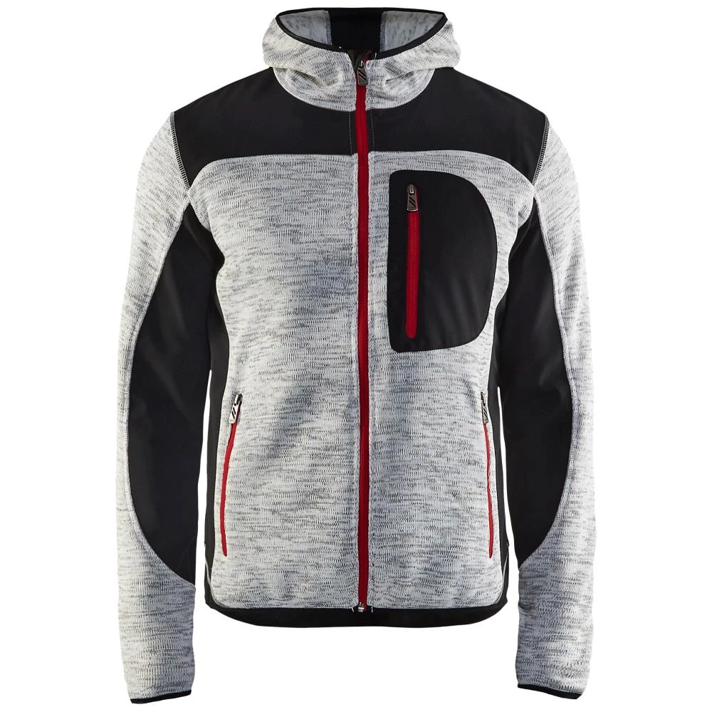 Strikket jakke med hætte i smart design og komfortabelt materiale med børstet inderside. Jakken har lynlås i kontrastfarve og er forstærket med slidstærk softshellmateriale på albuer, skuldre og nederst på ryggen. Brystlomme og forlommer med lynlås. Denne jakke er velegnet til både fritid og arbejde. Fås i flere farver og størrelser.