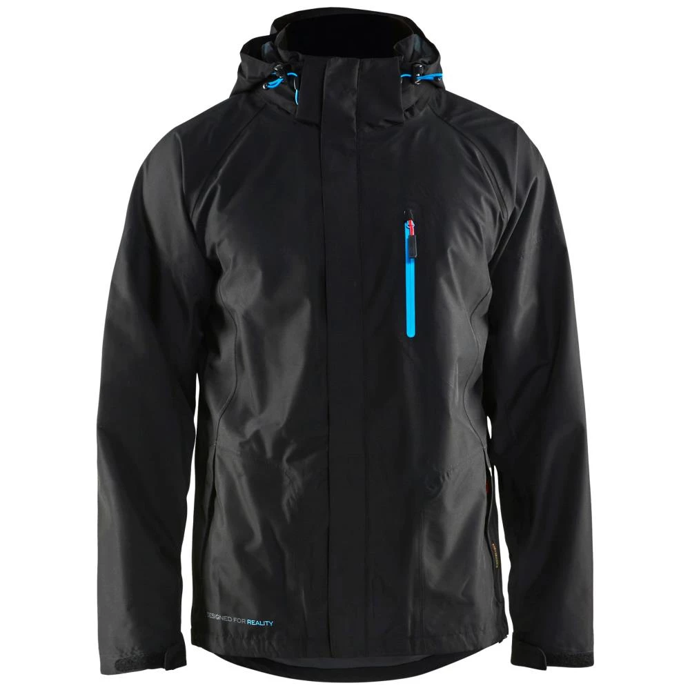 Vind- og vandtæt regnjakke med tapede sømme. Jakken har aftagelig hætte og meshfoer for god ventilation og åndbarhed. Skjult envejslynlås i plast, lukning foran med velcro, brystlomme og forlommer med lynlås, forlænget ryg, justerbar linning med snøre, samt justerbar nederst i ærmet med velcro. Fås i flere størrelser.