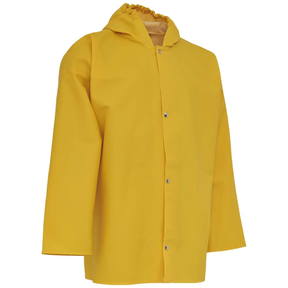 Fiskeolie- og kuldebestandig regnjakke med trykknapper og hætte med elastik. EN 343. Fås i flere farver og størrelser.