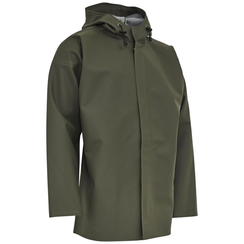 Fiskeolie- og kuldebestandig regnjakke i kraftigt materiale egnet til skov- og landbrug. Modellen har trykknaplukning og dobbelt vindfang, hætte med snøretræk, dobbeltsvejsede sidesømme, forstærket svejsning i belastede sømme og svejsede opsøm i ærmer. EN 343. Fås i flere farver og størrelser.