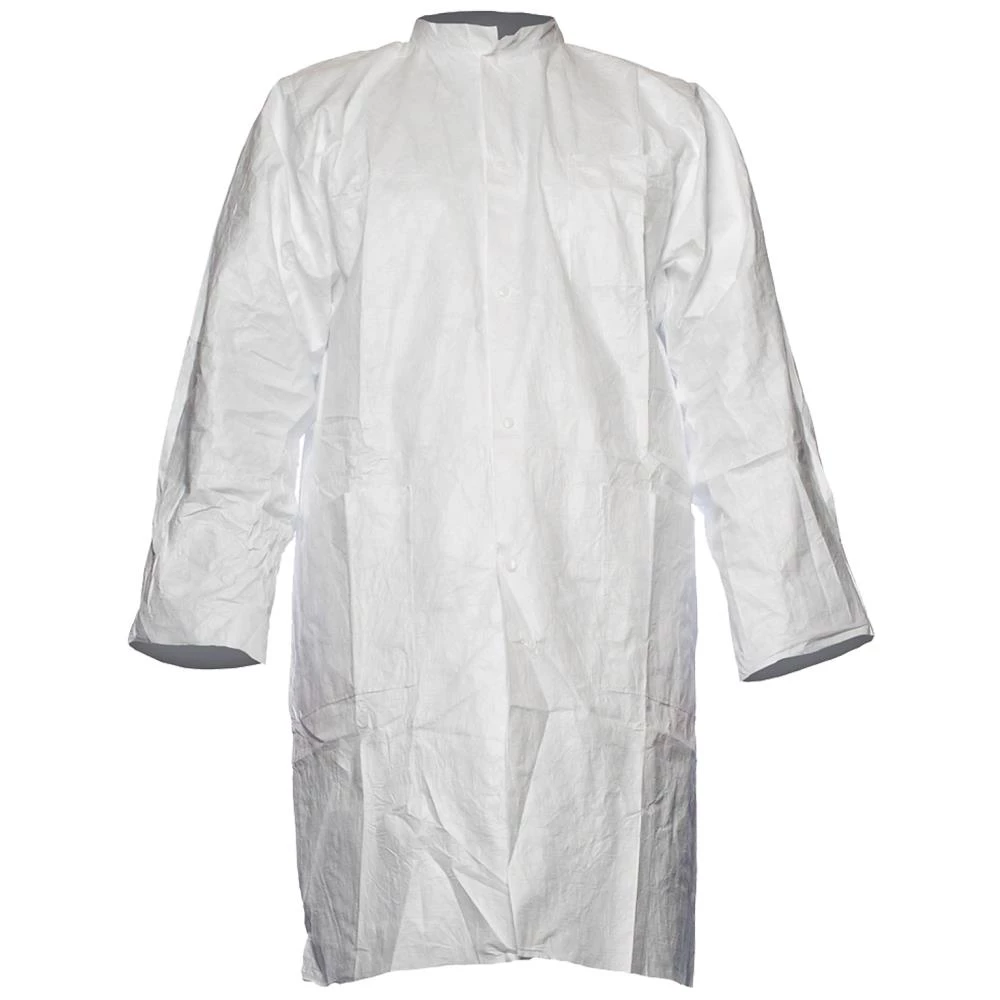 Dupont Tyvek 500 kittel med krave og fem trykknapper foran. Model uden lommer. Fremstillet af materialet Tyvek 1431N (polyethylenfibre). Materialet er slidstærkt, antistatisk, fnugfrit, ultralet og fleksibelt, og det beskytter mod støv, væskestænk og visse kemikalier. EN 1149-1, EN 14126, Type 6PB. Fås i flere størrelser.