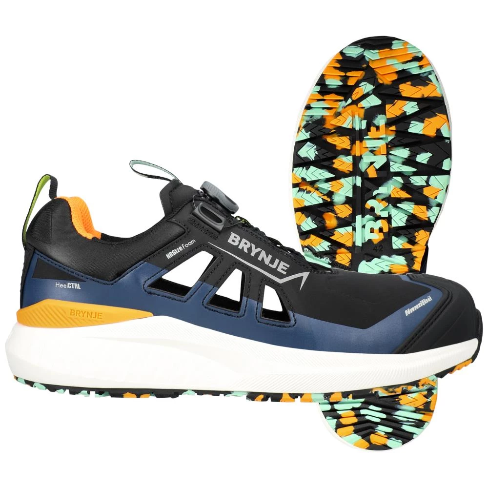 Brynje Lab Open sikk.sandal hurtigluk S1 100102. Brynje Lab Open åben sikkerhedssandal med hurtigluk og store luftkanaler for god åndbarhed og overdel af holdbar og slidstærk mikrofiber, hvoraf 30% er recycled. Innovativ sammensætning af sålen med ekstra NRGize foam-indlæg for intens energireturnering, der sender energien fra hvert skridt tilbage til fødderne. Slidstærk ydersål af gummi, mellemsål af EVA-skum. En HeelCTRL-indsats stabiliserer hælen og bidrager til et godt fit. Med Boa Fit System og PrimeFIT-pløs for perfekt fit. Indlægssålen af recycled, upcycled og biobaseret PU-skum med et CoolMax-cover for optimeret åndbarhed og svedtransportering. NanoToe-tåværn, fibersømværn med kevlar-fibre godkendt til 3 mm søm. Godkendt ProNose i formstøbt TPU. Certificeret efter EN ISO 20345:2022 standarden. ESD-godkendt og PVC-fri. S1PS SC SR FO. Fås i flere størrelser.
