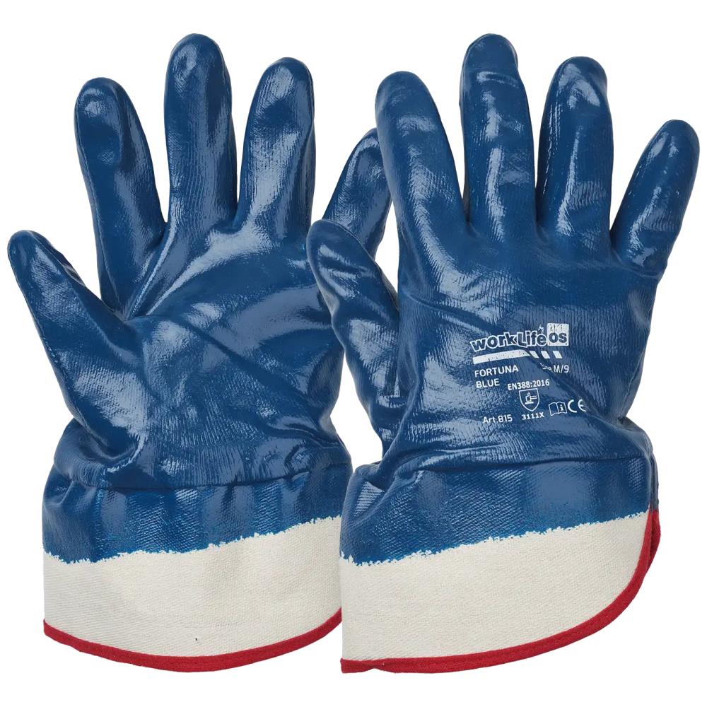 Heldyppet, syet handske med manchetkrave. Bomuldshandske med nitril-belægning og glat overflade. Ideel til entreprenørarbejde, beton-, træ- og metalindustri. Godkendelser: EN 388:2016 og EN 420:2003+A1:2009. Kategori II.