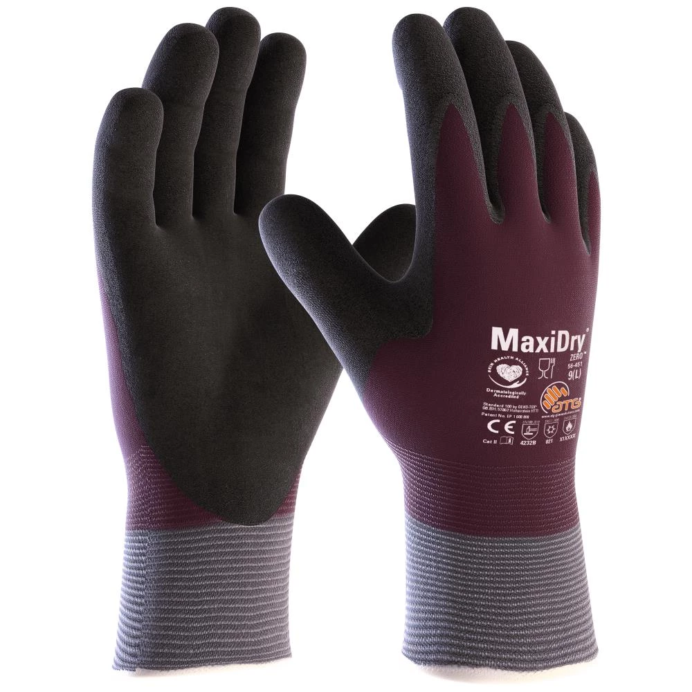 MaxiDry Zero er en slidstærk, olie- og væsketæt vinterhandske med indvendigt for, god pasform og godt greb. Dersuden er handsken fødevaregodkendt. MaxiDry forener komfort, væskebestandighed og THERMtech, som giver termisk modstandsdygtighed op til -10°C indeni handsken i forbindelse med høj aktivitet med en belægning, der er designet til at forblive fleksibel i temperaturer op til -30°C. Til beskyttelse mod varme eller kulde, da handsken har gode termiske isoleringsegenskaber, og det er uden at gå på kompromis med fleksibilitet, fingerfærdighed, vægt eller komfort. Belægning og sømløse strikketeknologier, som bibringer termiske isoleringsegenskaber, så handskerne kan modstå kulde. MaxiDry Zero er certificeret iht. europæiske fødevarestandarder og opfylder kravene i FDA CFR titel 21, del 177.
