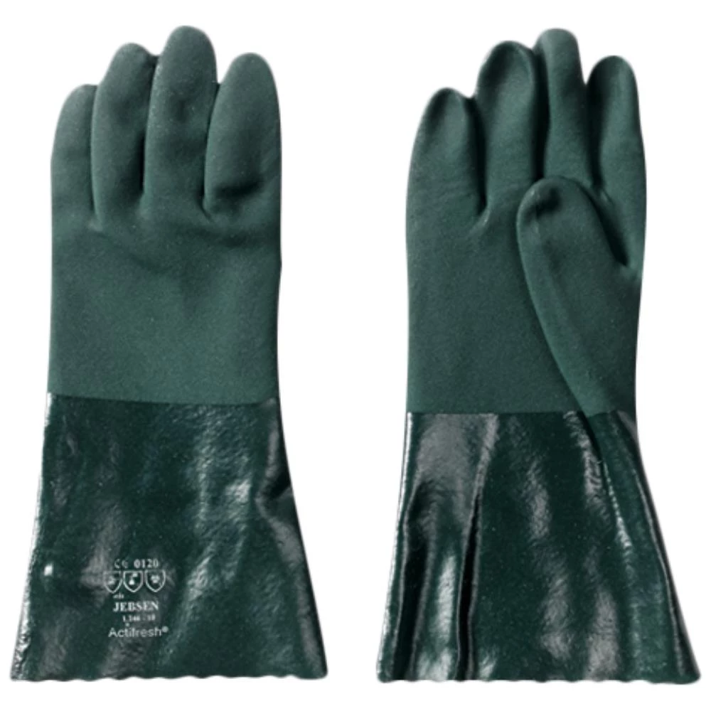 Heldyppet PVC-handske m/kraftigt jerseyfor. God olie- og kemikalieresistens. Sandet overflade for godt greb selv ved olierede emner. Actifresh-behandlet