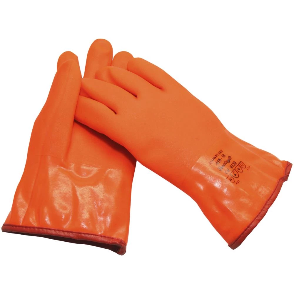 Termoforet, syet vinterhandske med slip-on krave. Tyk bomuldshandske med glat overflade og heldyppet PVC-belægning. Ideel til koldt arbejde ved transport, landbrug, vandværker og i entreprenør-regi. Godkendelser: EN 388:2016, EN 511:2006, EN ISO 374-1:2016/type A, EN ISO 374-5:2016 og EN 420:2003+A1:2009. Kategori III.