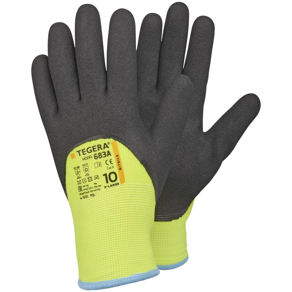 Kuldebeskyttende syntetisk handske. 3/4 dyppet nitril, akryl og polyester. Greb med sandet overflade. Vand- og olieafvisende inderhånd og knoer. Advarselsfarve hi-vis gul og sort. Kategori II. Til allround-arbejde.