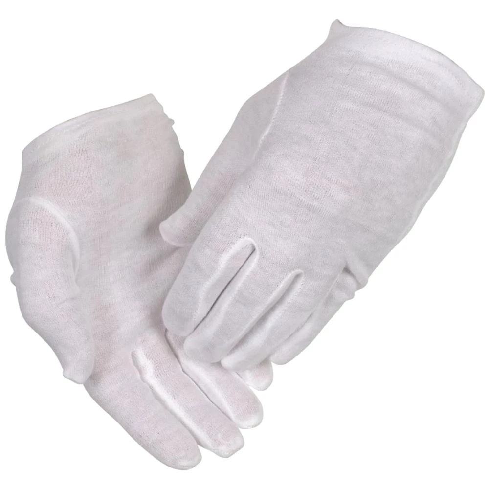 Hvid bomuldshandske i strålesyet interlock. 100 % bomuld. Stor fingerføling. Hvid bomuldskrave. Godkendelse: EN 420.