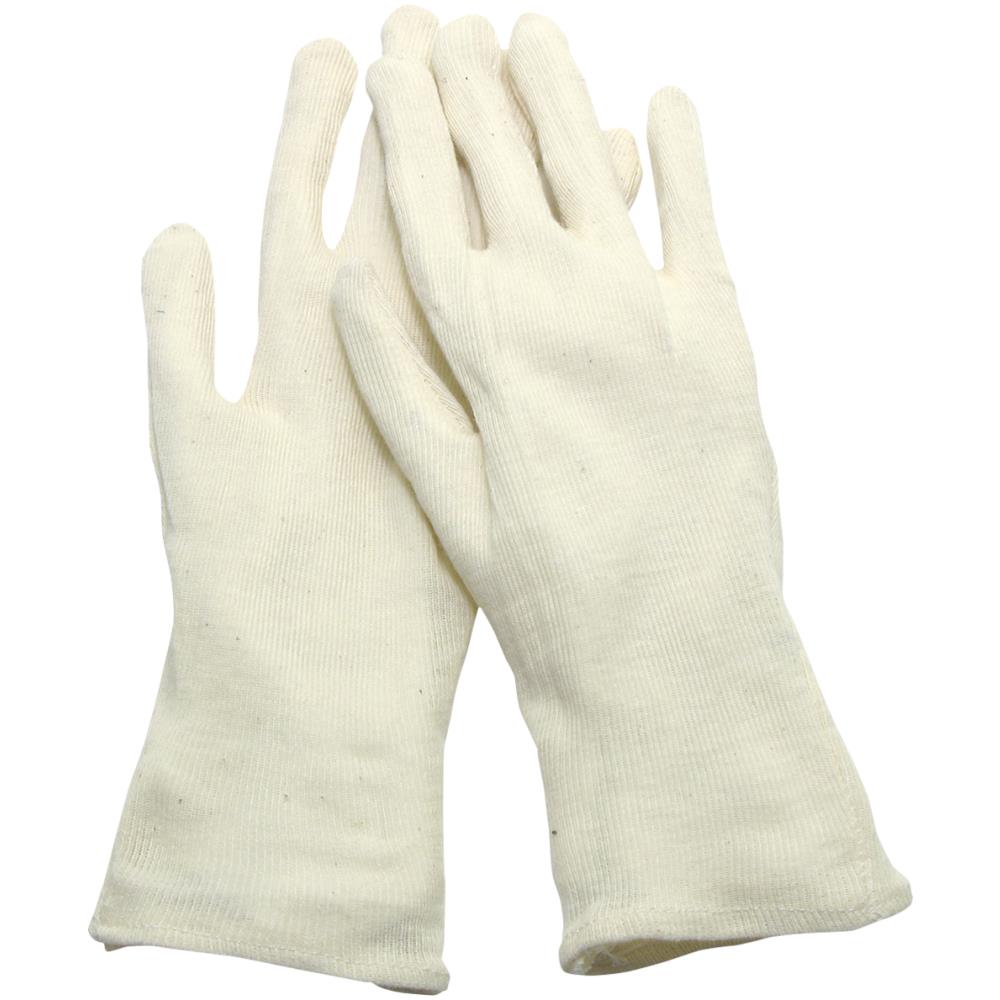 Tynd ubleget interlock handske af 100% bomuld. Bruges som inderhandske i gummi- og plasthandske. Kvalitet: C/D. 12 par/pk.