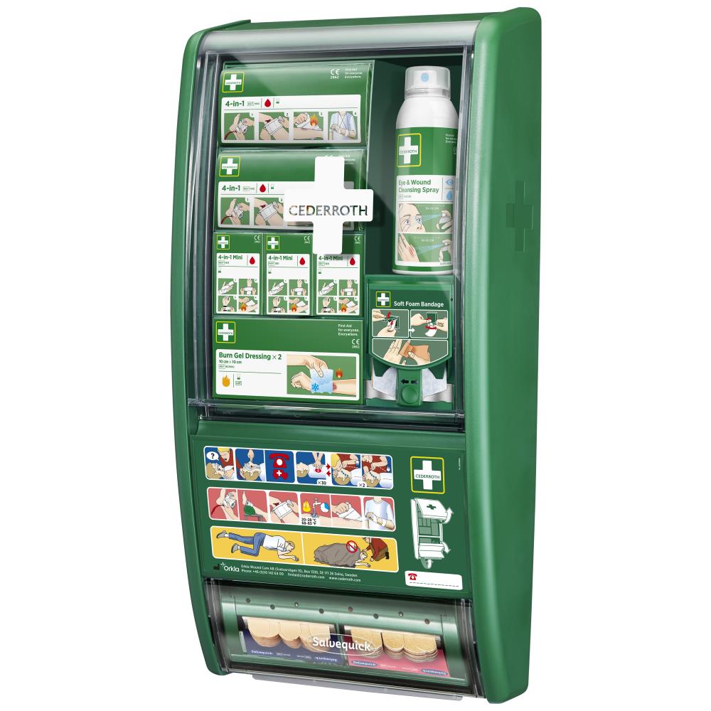 Cederroth førstehjælpsstation med indhold af en række førstehjælpsprodukter. Indholdet er tilpasset til at klare såvel store som små blødninger, brandsår og fremmedlegemer i øjet. Indhold: 2× Cederroth 4-i-1 Bloodstopper forbinding, 3× Cederroth 4-i-1 Mini Bloodstopper forbinding, 1× (×2) Cederroth brandsår gelforbinding, 1× Cederroth øje & sårrensespray 150 ml, 1× Salvequick plasterdispenser med 45 plastplastre og 40 tekstilplastre, 1× Softfoamdispenser med 6 cm × 4,5 mtr. softfoamplaster, 1× (×20) Salvequick sårrenseservietter, 1× Cederroth mund-til-mund-kit samt førstehjælpsinstruktioner. Alle produkter er lettilgængelige og beskyttet mod støv og fugt. Der er plads til yderligere produkter bag låg med førstehjælpsinstruktioner. Plasterdispensere er placeret med nem tilgang. Der medfølger nøgle til udskiftning af plastre. CE-mærket.