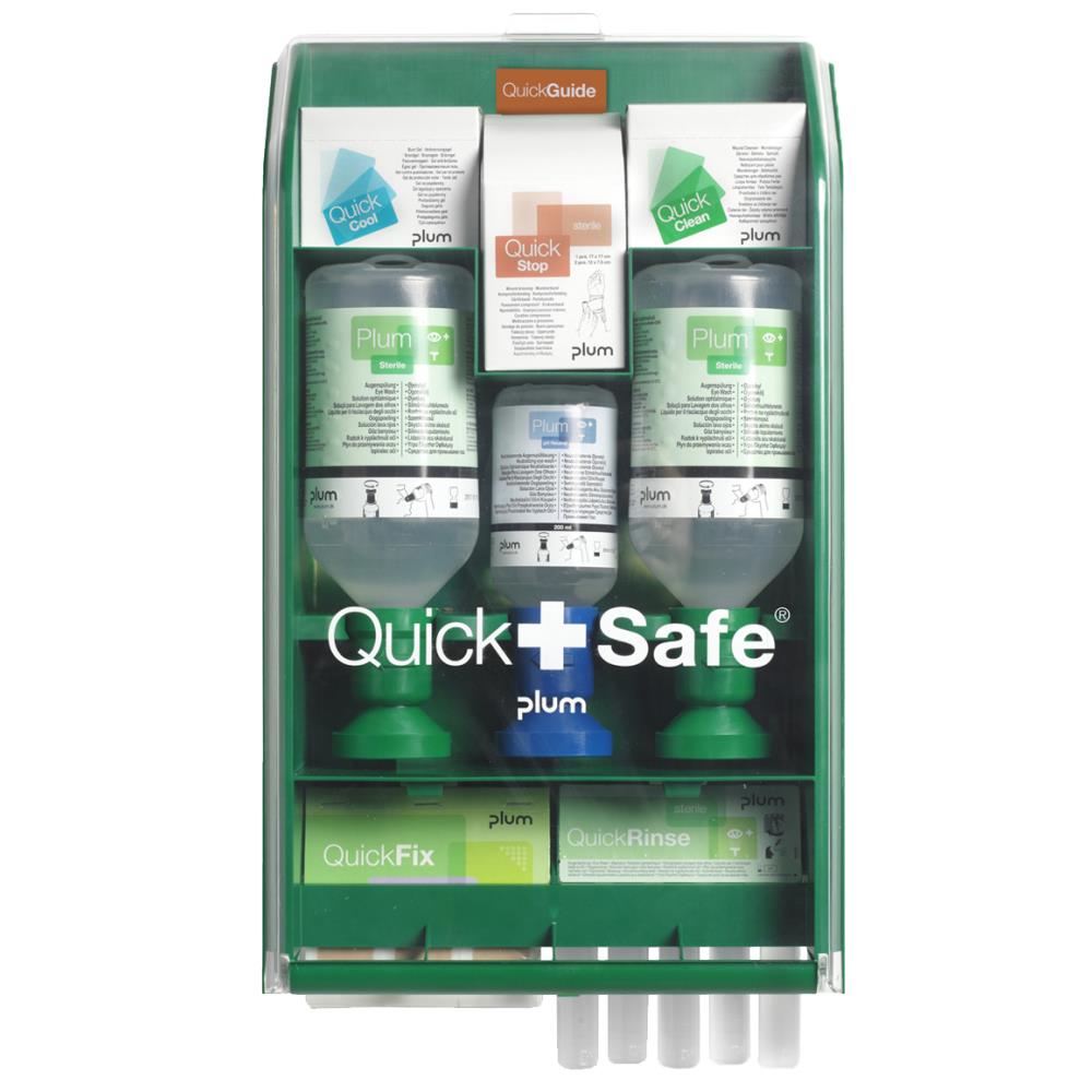 Førstehjælpsstation til vægmontering. Indeholder 2 stk. 500 ml Plum øjenskyller, 1 stk. 200 ml pH-Neutral, 20 stk. QuickClean sårrenseservietter, 18 stk. QuickCool brandgel, 1 stk. QuickStop kompresforbindingssæt, 5 stk. QuickRinse øjenskylleampuller, 1 stk. QuickFix Elastic plasterrefill. Kabinet af slagfast plast med transparent låg. Leveres med brugsanvisning og materiale til vægmontering.