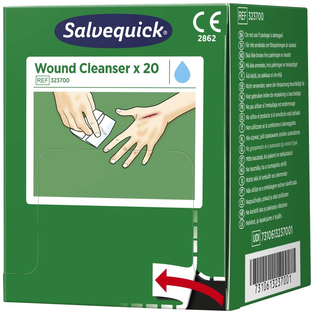 Salvequick sterile sårrenseservietter med fysiologisk 0,9 % NaCl-opløsning. Hver serviet måler 11×12 cm i udbredt stand. Bruges til at rense sår inden såret forbindes. Dermed er der færre bakterier og snavs, og risikoen for betændelse i såret minimeres. Æske med 20 stk.