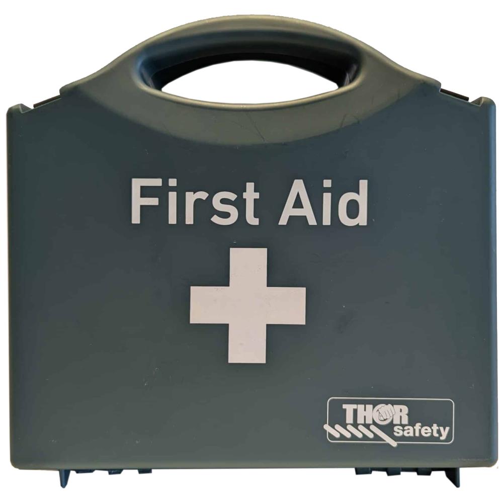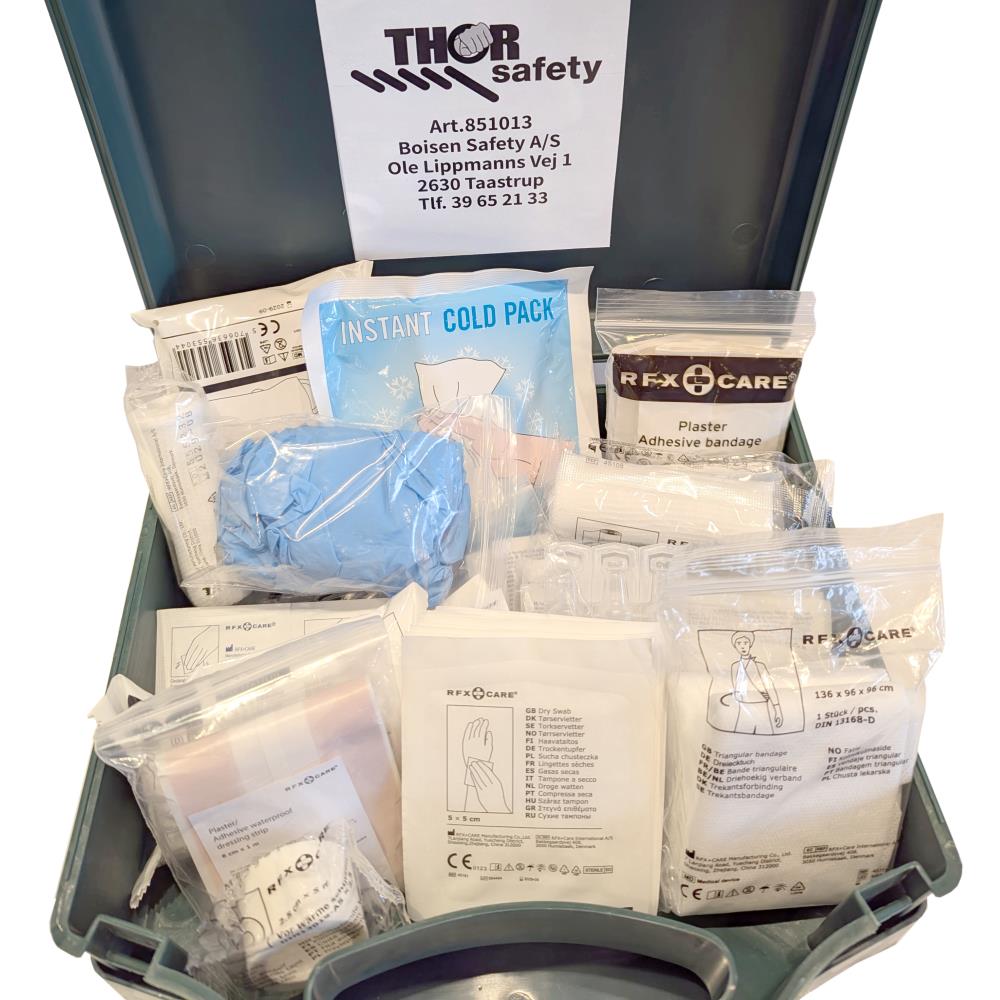 Thor førstehjælps kasse med indhold. Til behandling af sår. Kassen indeholder rense servietter 12 stk, armklæde 136×96×96, plaster tape 5 mtr × 2,5 cm, steril kompresforbinding 17×17 cm, elastik bandage 4 mtr × 8 cm × 2, aftørrings papir pakket i film 5×5 cm, øjenskyl natriumklorid 15 ml, saks, pincet, bandage 10 × 6 cm, finger plaster pakke, transparant plaster pakke, varmetæppe, nitril handsker 2 par, plaster 6×1 mtr, renseserviertter 10 stk, ispakke 100 g og finger bandage 6×100 cm. Kassen kommer med ophæng.