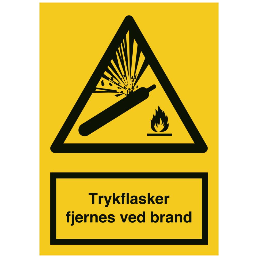 Advarselsskilt i plast med symbol og dansk tekst “Trykflasker fjernes ved brand”.