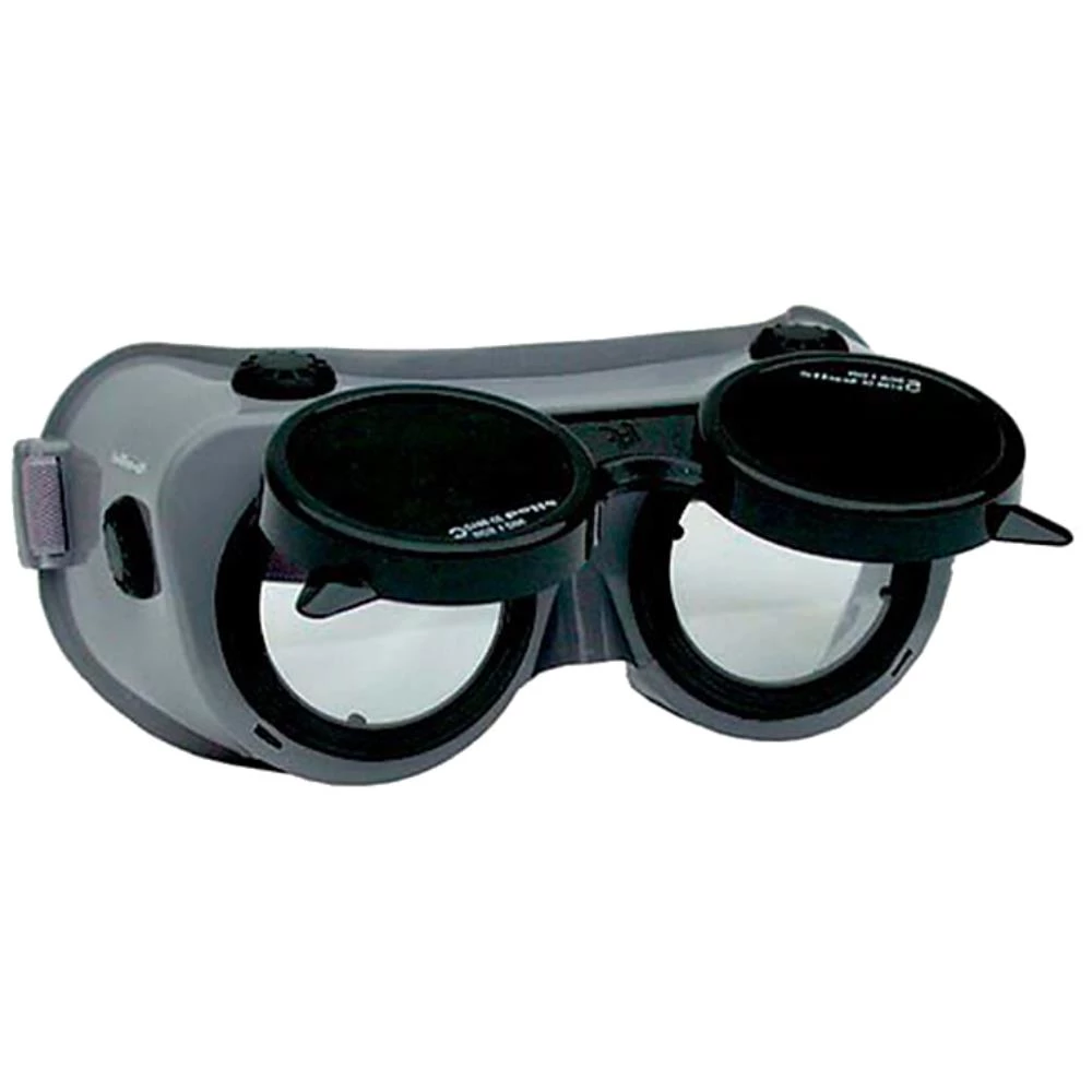 Coversal kombi-kapselbrille med opklappelig svejseforsats. Ramme af selvslukkende plast, som beskytter mod UV- og IR-stråler. Rammen har ø50 mm linser af klar acetat. Forsatsen har ø50 mm linser af mineralglas farve 5. Alle linser kan skiftes til andre farver efter behov. DIN 5. EN 166.