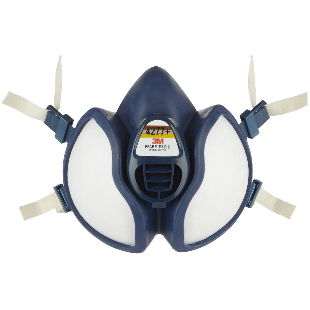 3M Vedligeholdelsesfri halvmaske 4277+ ABE1P3 R D. Let, vedligeholdelsesfri halvmaske/åndedrætsværn med indbyggede filtre – klar til brug. Effektiv og komfortabel beskyttelse i forskellige klasser. Et forbedret ventilsæt er med til at reducere modstanden ved udånding for at lette vejrtrækningen. Blød og tætsiddende ansigtstætning fremstillet af tekstureret, ikke-allergent (silikonefri) materiale. Justerbart hovedbånd og nakkestropper, der er nemme at fastgøre. Centralt placeret udåndingsventil er med til at reducere ophobning af varme og fugt under forhold med høj temperatur og luftfugtighed. Leveres inkl. genlukkelig pose til hygiejnisk opbevaring og transport.