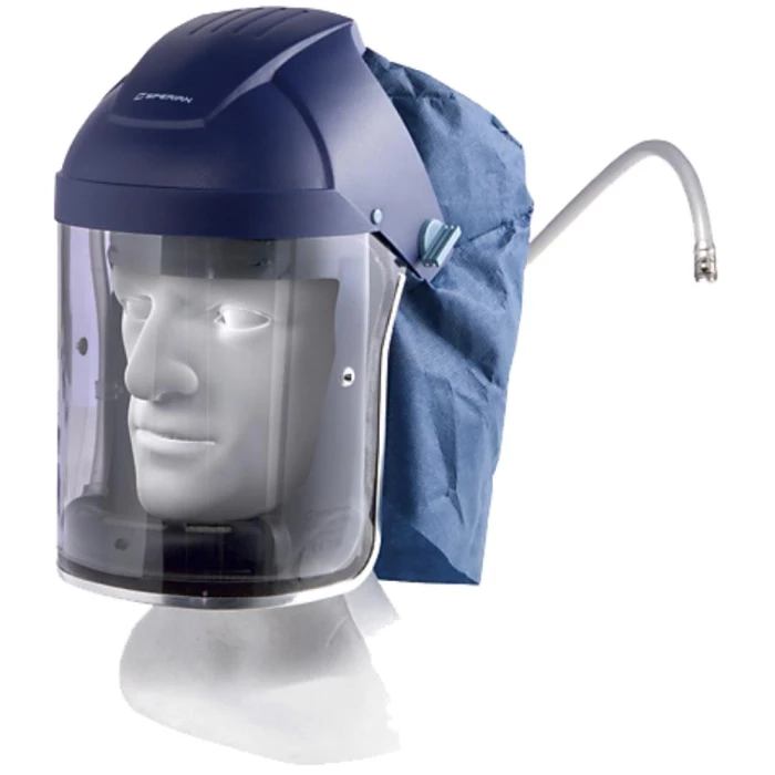 Forbedret udgave af det klassiske Airvisor øjen- og åndedrætsværn. Stort visir af acetat med enormt synsfelt og kraftig ansigtstætning af skum, god plads til briller og god kemikalieresistens. Visiret kan vippes op og låses fast. Fleksibel mellemslange med luftfordeler og kobling til Airvisor bælte. Luftfordeleren er placeret i bunden af visiret, så luften ikke føles kold ét sted og så dugdannelse undgås. Hals og ører er beskyttet mod snavs af et udskifteligt nakkeslag. Hovedbespændingen har kraftig polstring og praktisk håndhjul. Let overtryk i masken forhindrer lækage. Matsort finish indvendigt i skærmen mindsker refleksioner. Beskyttelsesfaktor på 2000. Husk godkendt forsyningsslange. EN 14594 kl. 4A, EN 166 2F2B9.