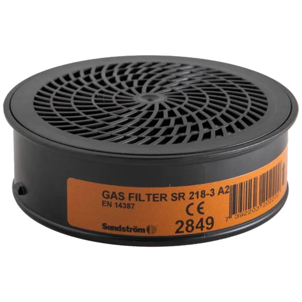 Gasfilter SR 218 til brug med Sundström halvmasker og helmasker. Filteret er af typen A og yder beskyttelse mod organiske gasser og dampe, såsom opløsningsmidler, med kogepunkter > +65°C. Filteret kan nemt kombineres med partikelfilter SR 510 P3 R for også at opnå beskyttelse mod aerosoler (partikler), f.eks. under sprøjtemaling. EN 14387:2004 + A1:2008.
