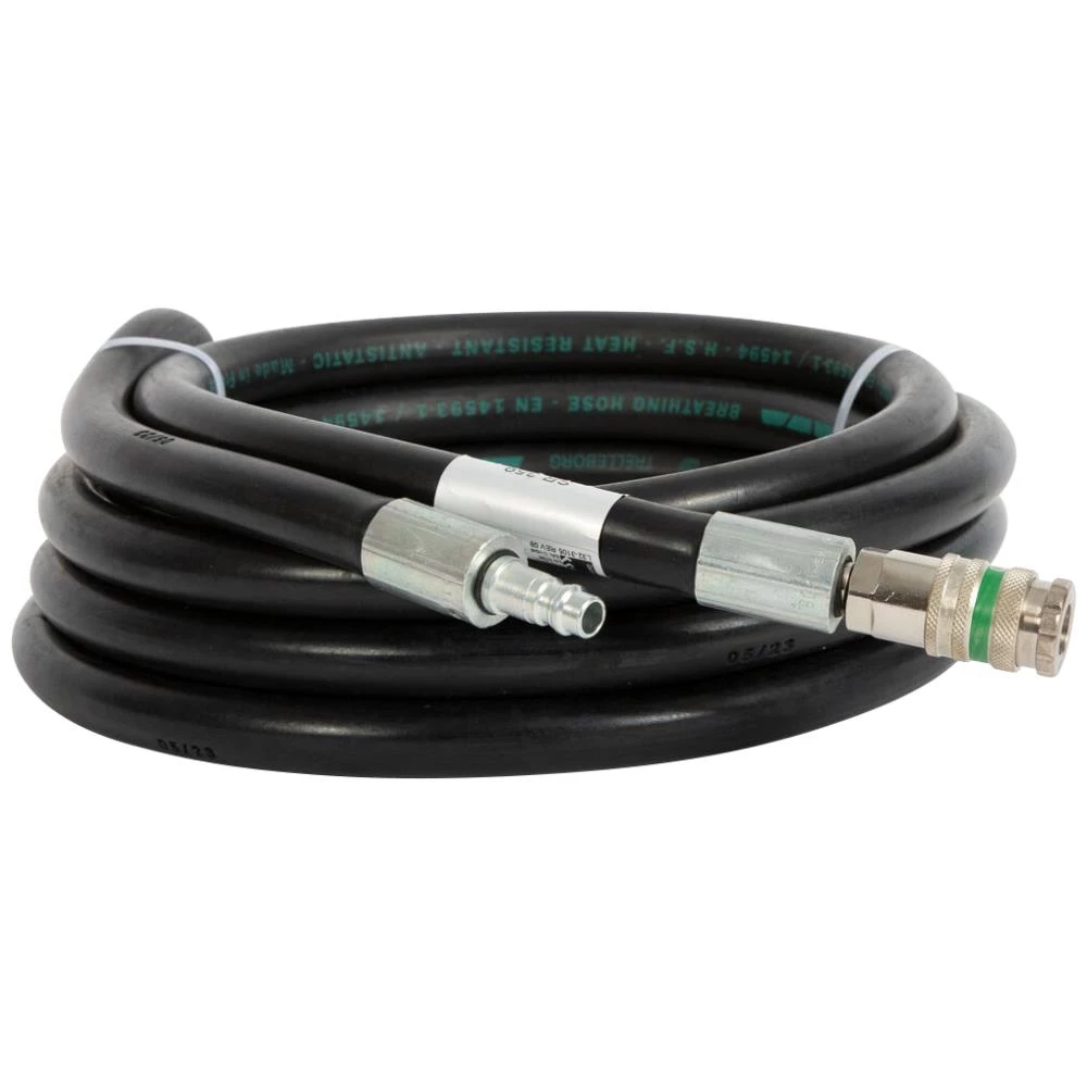 5 mtr. luftslange til trykluftforsynet åndedrætsværn. Monteret med Cejn sikkerhedskoblinger. Indsættes mellem bæltet med reguleringsventil og filterpanel til rensning af kompressorluften, for eksempel SR 99. 9,5/18 mm. Gummislange af polyester forstærket EPDM. Antistatisk og varmeresistent. Hvis der anvendes varmer SR 99H med filterpanel SR 99, så skal luftslange SR 359 altid anvendes. Testet og godkendt til kombination med følgende udstyr: SR 90/SR 200/SR 63 Airline og SR 307/SR 507 trykluftindsats.