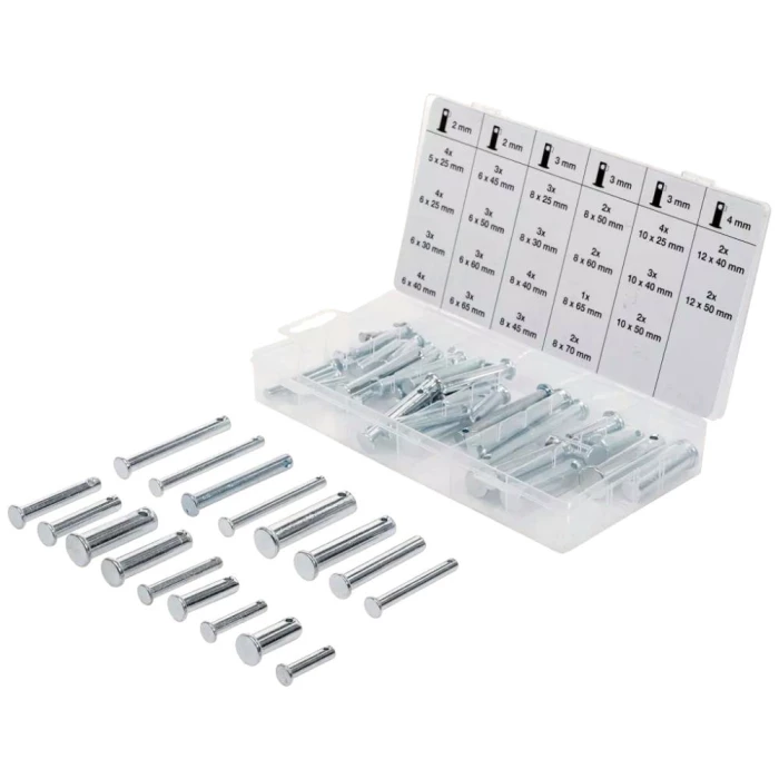 Sikringsboltsortiment med 60 dele: 4 × ø2 mm, 5 × 25 mm – 4 × ø2 mm, 6 × 25 mm – 3 × ø2 mm, 6 × 30 mm – 4 × ø2 mm, 6 × 40 mm – 3 × ø2 mm, 6 × 45 mm – 3 × ø2 mm, 6 × 50 mm – 3 × ø2 mm, 6 × 60 mm – 3 × ø2 mm, 6 × 65 mm – 3 × ø3 mm, 8 × 25 mm – 3 × ø3 mm, 8 × 30-4 × ø3 mm, 8 × 40 mm – 3 × ø3 mm, 8 × 45 mm – 2 × ø3 mm, 8 × 50 mm – 2 × ø3 mm, 8 × 60 mm – 1 × ø3 mm, 8 × 65 m – 1 × ø3 mm, 8 × 65 mm – 4 × ø3 mm, 10 × 25 mm – 3 × ø3 mm, 10 × 40 mm – 2 × ø3 mm, 10 × 50 mm – 2 × ø4 mm, 12 × 40 mm – 2 × ø4 mm, 12 × 50 mm.