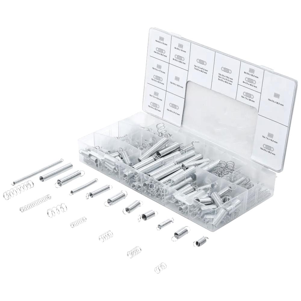 Spændings- og trykfjedresortiment med 200 dele. Kompressionsfjedre: 5,5×17,5 mm – 5,5×38,0 mm – 6,5×10,0 mm – 7,0×12,5 mm – 7,0×19,0 mm – 9,0×35 mm – 9,5×16 mm – 9,5×19 mm. Trækfjedre: 4,0×79,5 mm – 4,5×44,5 mm – 5,0×20,5 mm – 5,5×25,5 mm – 6,5×22,0 mm – 7,0×98,0 mm – 7,0×51,0 mm – 8,0×28,5 mm – 8,0×31,5 mm – 8,0×44,5 mm – 8,5×36,5 mm – 8,5×47 mm.