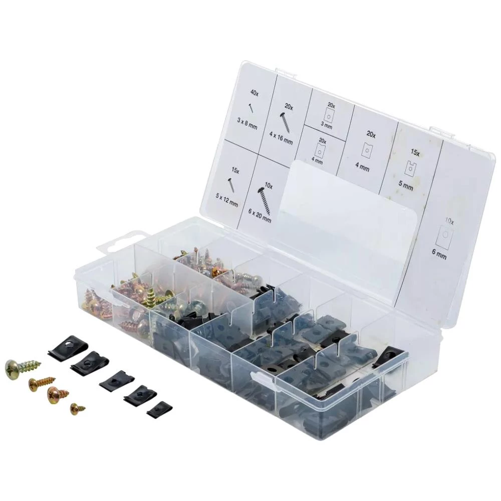Clips-/skruesortiment med 170 dele: 40×3×8 mm – 20×4×16 mm – 15×5×12 mm – 10×6×20 mm. 85 fenderklemmer/kropsmøtrikker i forskellige størrelser og former.