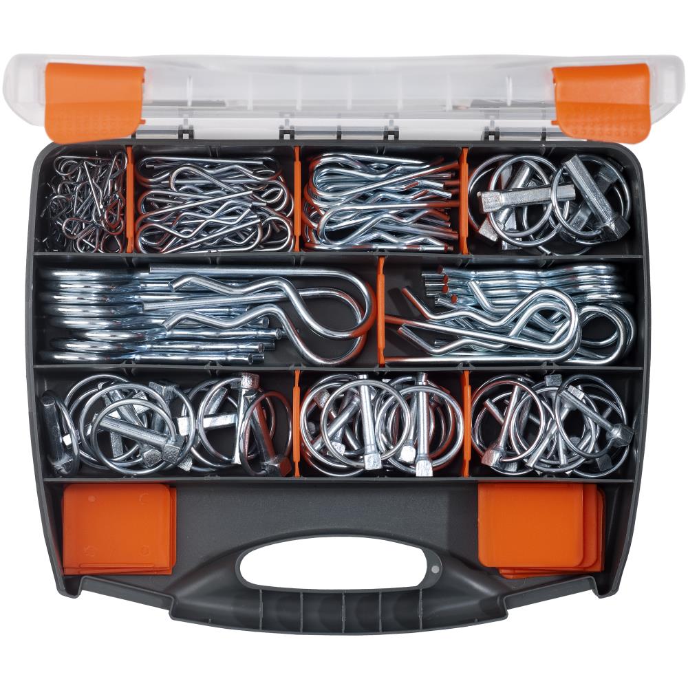 Galvaniseret ring- og fjedersplitsortiment med 126 assorterede dele i de mest gængse størrelser. Leveres i praktisk inddelt opbevaringskuffert.