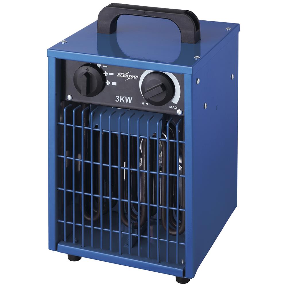 Blue Electric industrivarmeblæser i robust metalkonstruktion med praktisk bærehåndtag. Blæser i tre trin: 1.000 W / 2.000 W / 3.000 W. Justerbar termostat. Overophedningssikring. Schuko-stikprop og 1,6 mtr. kabel. IP24.
