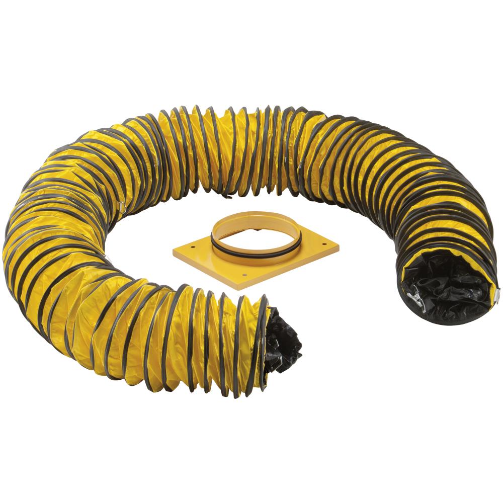 Udblæsningssæt , bestående af aftræksslange Ø 200 mm, 10 mtr lang. Med fastgørelsesøjer af metal til ophængning på stedet, med tilslutningsflange, til fordeling af udblæsningsluften i rummet. Til affugtning af hulrum, f.eks. over mellemdæk, og til yderligere påblæsning af våde arealer.