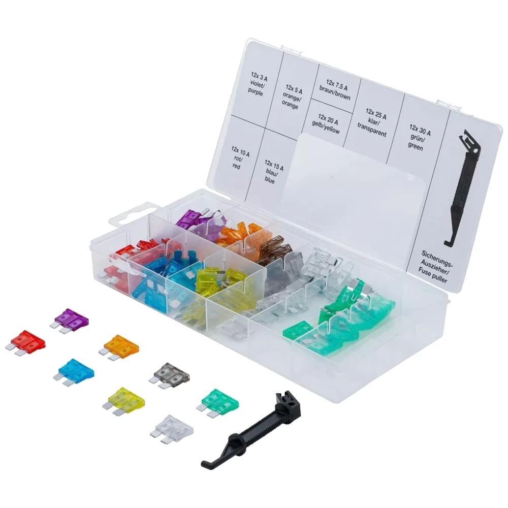 Bilsikringssortiment med 96 sikringer farvekodet efter størrelse. Indhold: 12 stk. bilsikringer 3 A, 12 stk. bilsikringer 5 A, 12 stk. bilsikringer 7,5 A, 12 stk. bilsikringer 10 A, 12 stk. bilsikringer 15 A, 12 stk. bilsikringer 20 A, 12 stk. bilsikringer 25 A, 12 stk. bilsikringer 30 A samt sikringsudtrækker. Leveres i sortimentsæske.