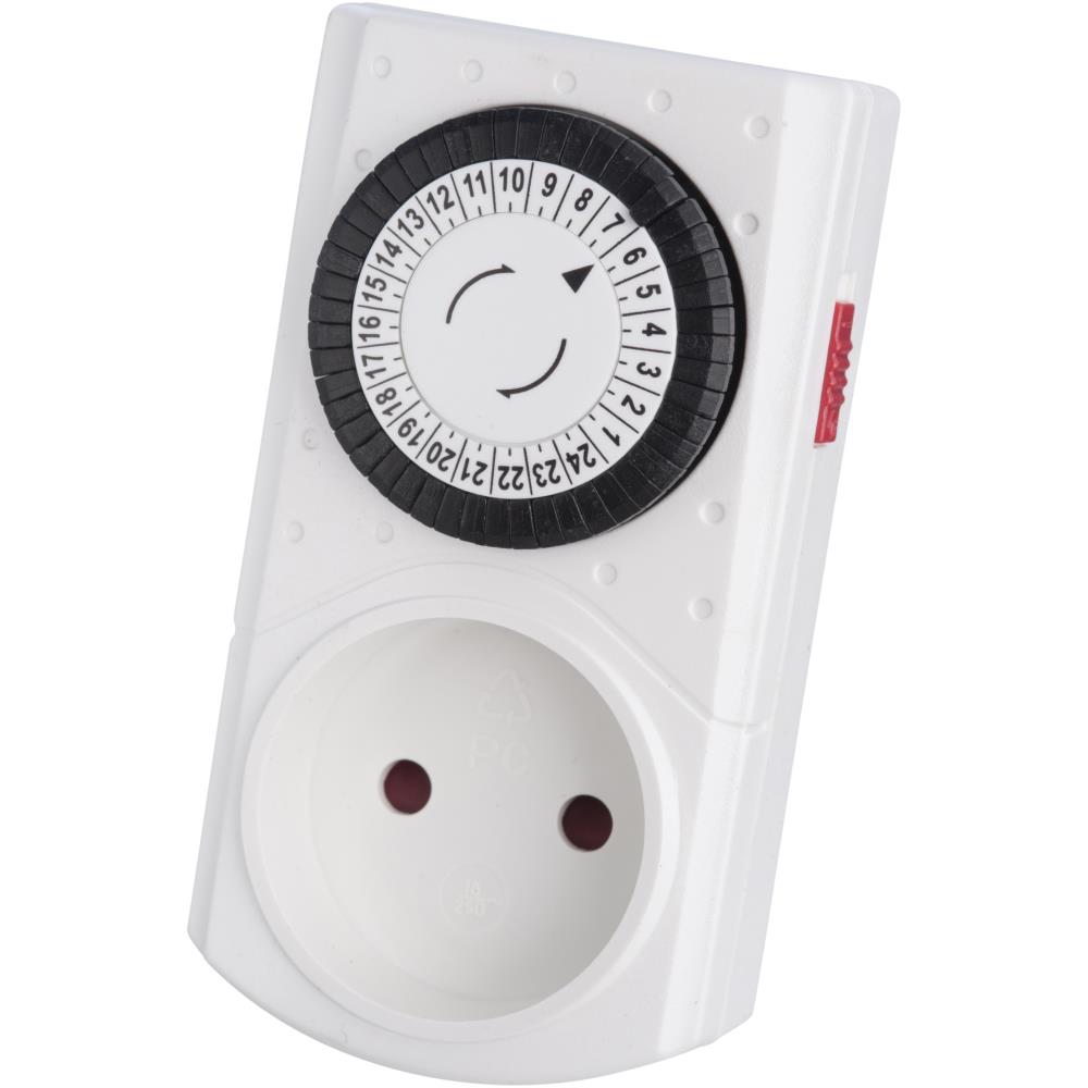 Mekanisk mini-døgnur uden jord. Funktioner: minimumsindstilling pr. pind 30 min., maks. 48 tænd/sluk pr. dag. 230 V, 16 A. 3.680 W. IP20.