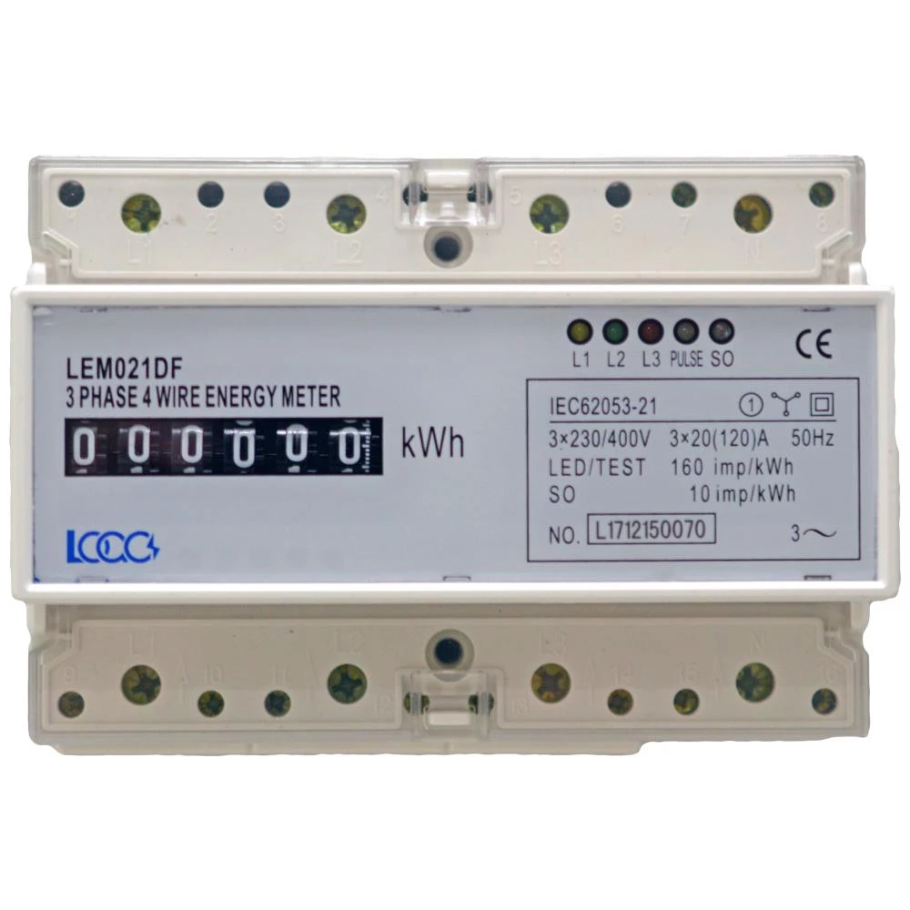 Elmåler 3P + N. Bi-måler 3×230/400 V, 3×20 (120) A, 50 Hz. Syv moduler (125 mm bred).