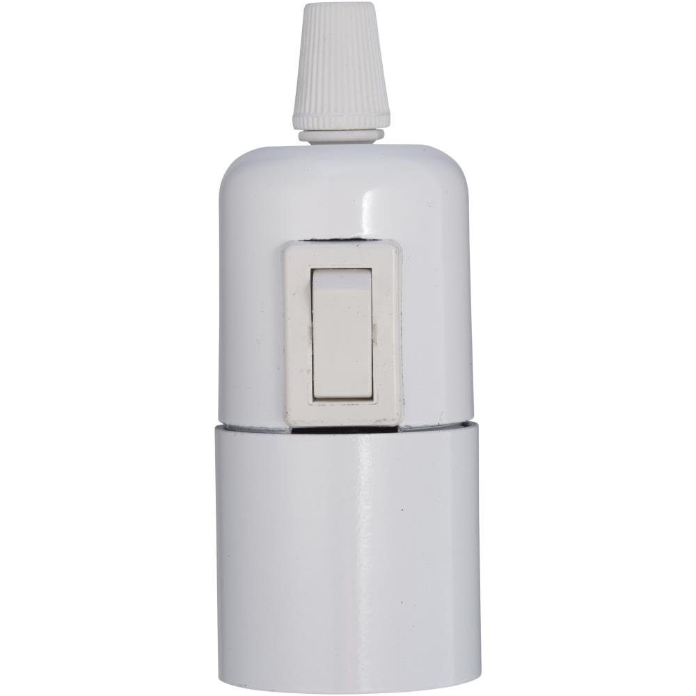 Blank, hvid E27 fatning med afbryder, trækstang og beskyttelseshætte. 250 V, 2 A. 500 W.