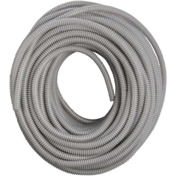 Grå flexrør til trækning af installationsledninger eller kabler. Fås i flere dimensioner og længder.