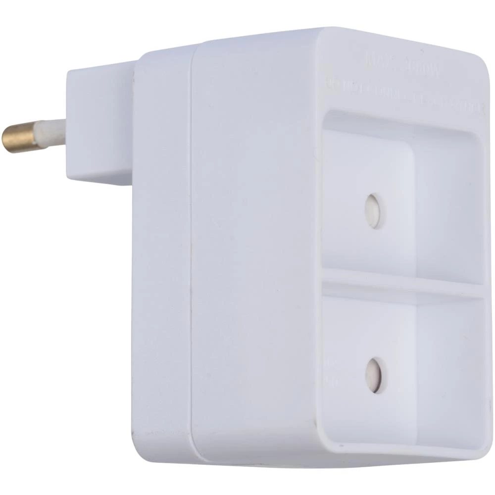 Hvid, børnesikret forgreningsled til to flade stik. 230 V, 16 A. Uden jord.