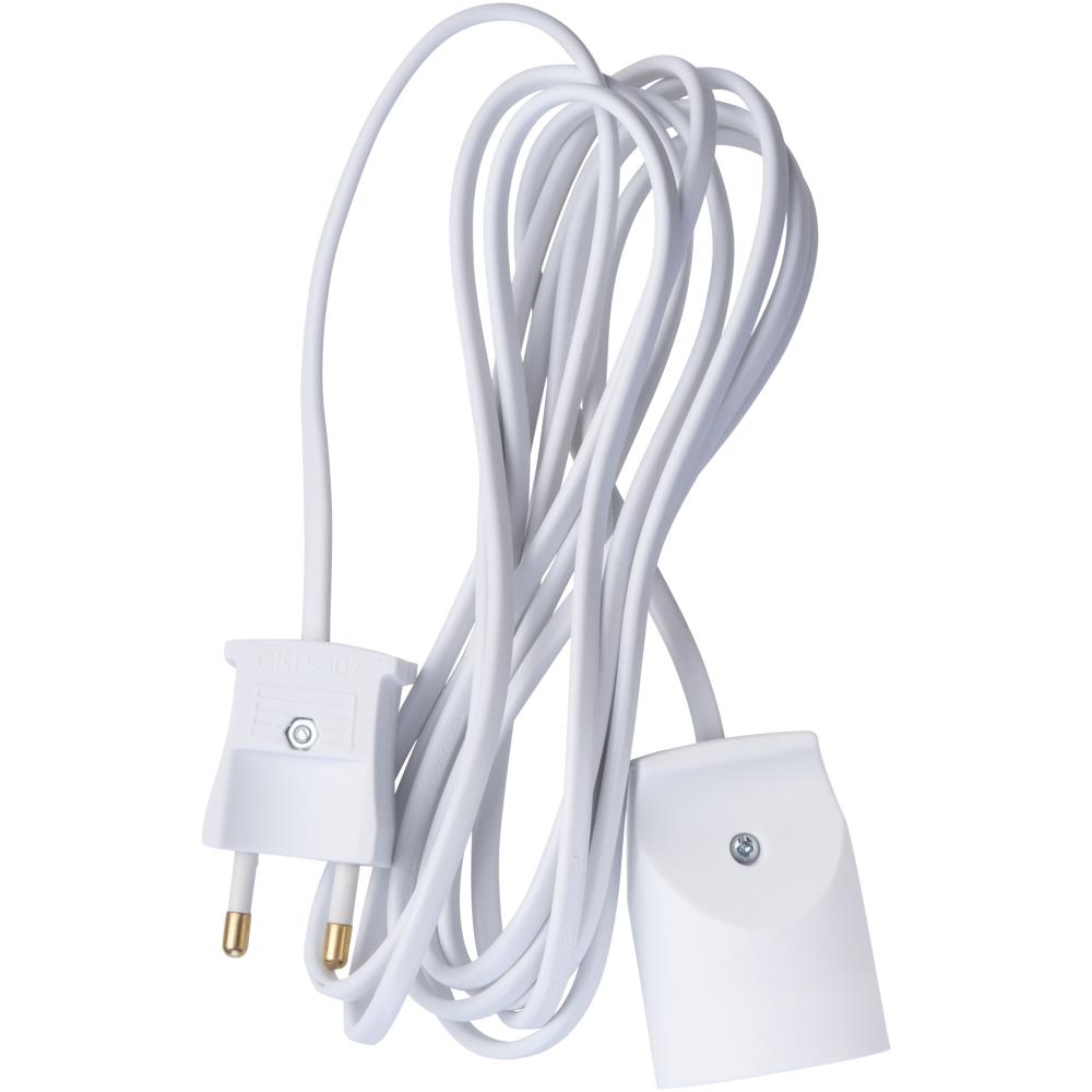 Hvid, børnesikret adapterkabel uden jord. Med 2G0,75 mm² H03VVH2-F kabel. 230 V, 10 A. 2.300 W. Fås i flere længder.
