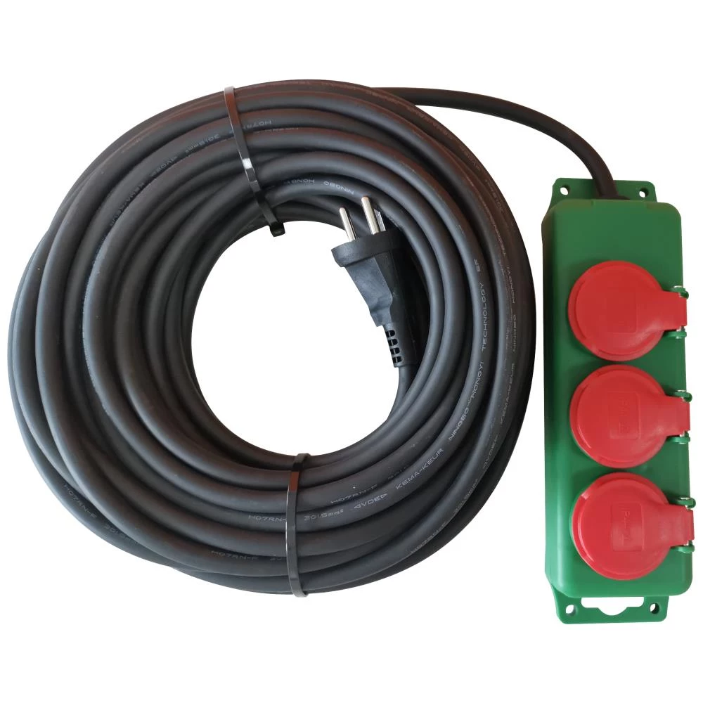 20 mtr. Bandit kabelsæt med 3G1,5mm² neopren-gummikabel H07RN-F og slagfast stikdåse 230 V/16 A. IP44. Fås med hhv. 3 eller 5 stik.