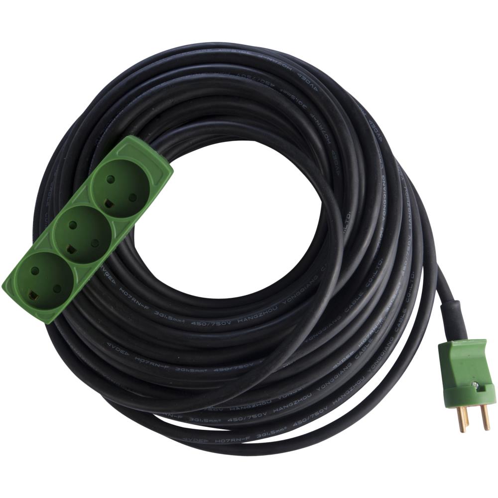 Kabelsæt med DK stikprop og 3-vejs stikdåse med jord. Med 3G1,5 mm² neopren-gummikabel H07RN-F. 230 V, 16 A. 3.680 W. IP20. Fås i 3 længder: 10, 15 og 25 mtr.