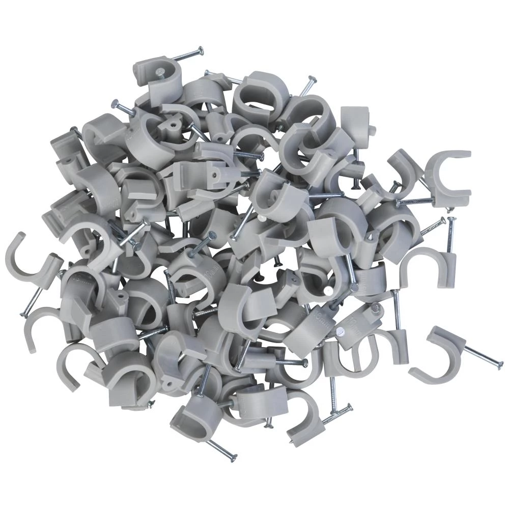 Grå, rund ledningsclips til fastsættelse af rund ledning/kabel. Fås i flere varianter.