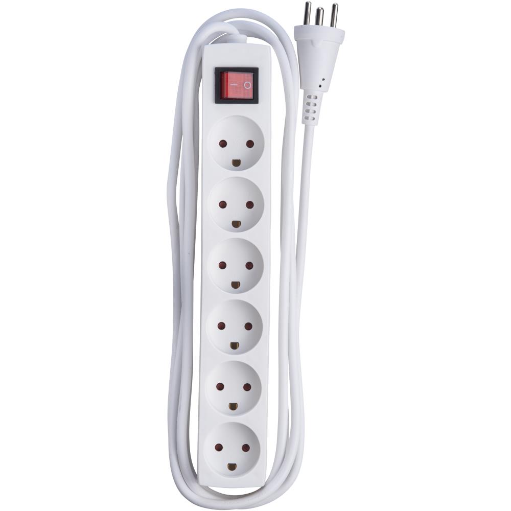 Hvid 6-vejs stikdåse med afbrder. Med jord. Med 3 mtr. ledning 3G1 mm² H05VV-F. 203 V, 13 A. 2.990 W. Børnesikret, ikke-genmonterbar model.